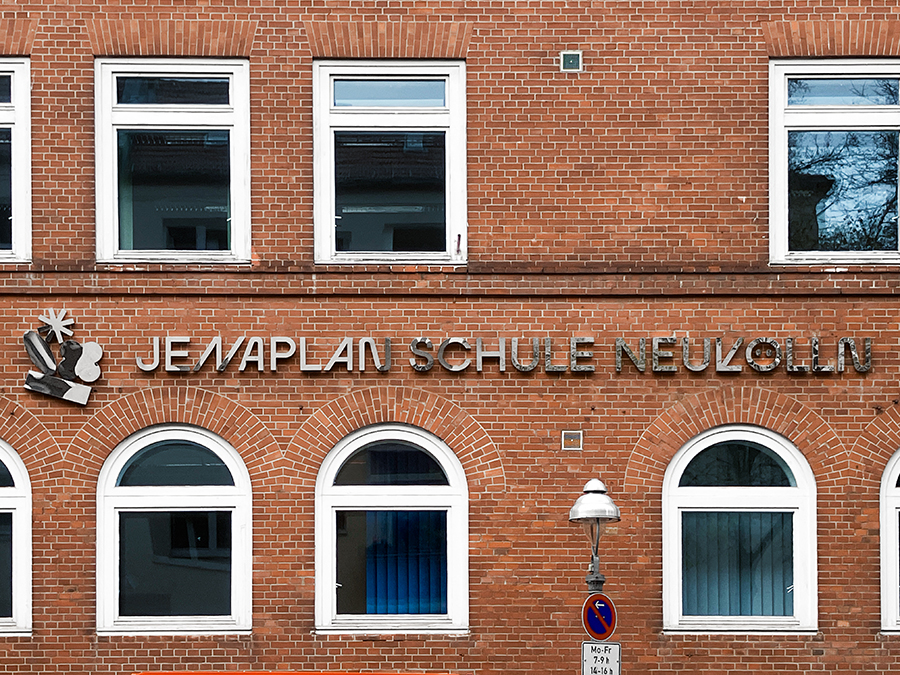 3D-Fassadenlogo für das Bezirksamt Neukölln von Berlin – Edelstahl-Schriftzug an der Jenaplan Schule Neukölln