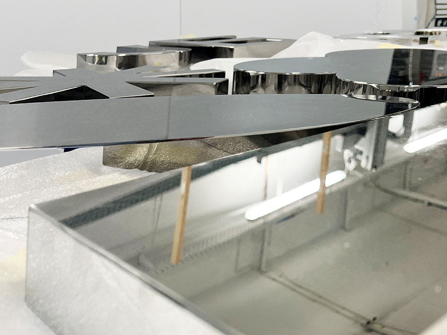 Die Herstellung der Edelstahlbuchstaben erfolgte mit höchster Präzision. Neben der Materialwahl – langlebiger, witterungsbeständiger Edelstahl – lag der Fokus auf einer makellosen Oberflächenqualität. Polierte Kanten und gleichmäßige Flächen sorgen dafür, dass der Schriftzug auch bei wechselnden Lichtverhältnissen hochwertig wirkt. Die massive Tiefe unterstreicht die Wertigkeit der Anlage und sorgt für eine nachhaltige visuelle Präsenz.
